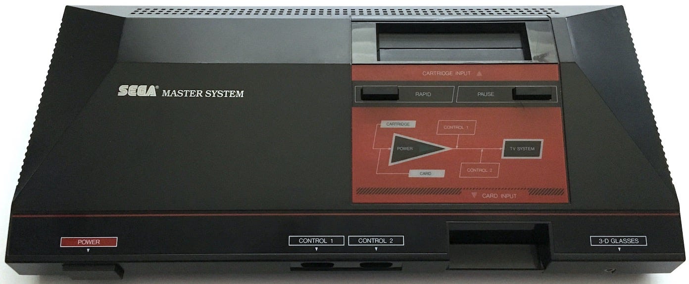 In 1987, the international SMS was brought to Japan with a few additions. The Japanese unit brought back the FM synthesizer, had a built in port for the 3D Glasses (rather than using a Sega Card), and included a Rapid Fire unit. The BIOS was also different and with no game inserted would play the Space Harrier theme utilizing both the PSG and FM chip.