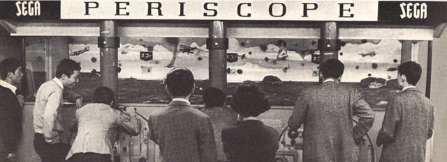 The first game made by Sega was Periscope. The game had been sketched out by Rosen and was then handed off to Shikanosuke Ochi to assemble a team and develop the game. It was originally a three-player, electromechanical, shooting game. It simulated a submarine attacking warships. The ships were cardboard and hung from chains moving across a backdrop of an ocean. The players would then look through a periscope and fire torpedoes represented by lines of colored lights and accompanied by sound effects. Each player had five torpedoes. At the game’s first demonstration at the 23rd London Amusement Trades Exhibition, Periscope did well and earned $100 which would be about $1000 in 2025 dollars. After some initial sales, customers complained that while the game was extremely popular, it had a poor profit as the machine was expensive at $1295 (a significant portion of that price being a Japanese export tax). The response from Sega was twofold. First, they recommended increasing the price-per-play to 25¢, and second, Sega made a cheaper, smaller, single-player version of the game. Periscope was a massive success, and it largely set the standard of 25¢ per play for arcades in North America while raising the expectations of arcade goers. For Sega, Periscope proved a market and the company made a series of electro-mechanical games of various kinds until 1977.