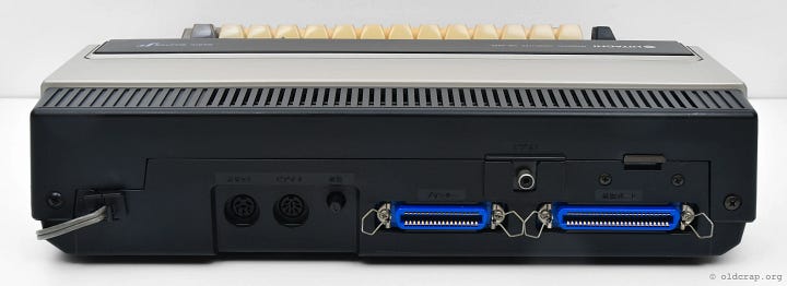 The final 6800 8bit from Hitachi was the MB-6885 or Basic Master Jr of 1981. This was a 16K RAM and 16K ROM unit with floating point capable BASIC. It also had dedicated VRAM allowing a resolution of 256 by 192 pixels, the PSU was integrated into the main computer housing, and had a cassette speed of 1200bps. Other immediately noticeable changes are the printer port and expansion port on the rear of the machine.