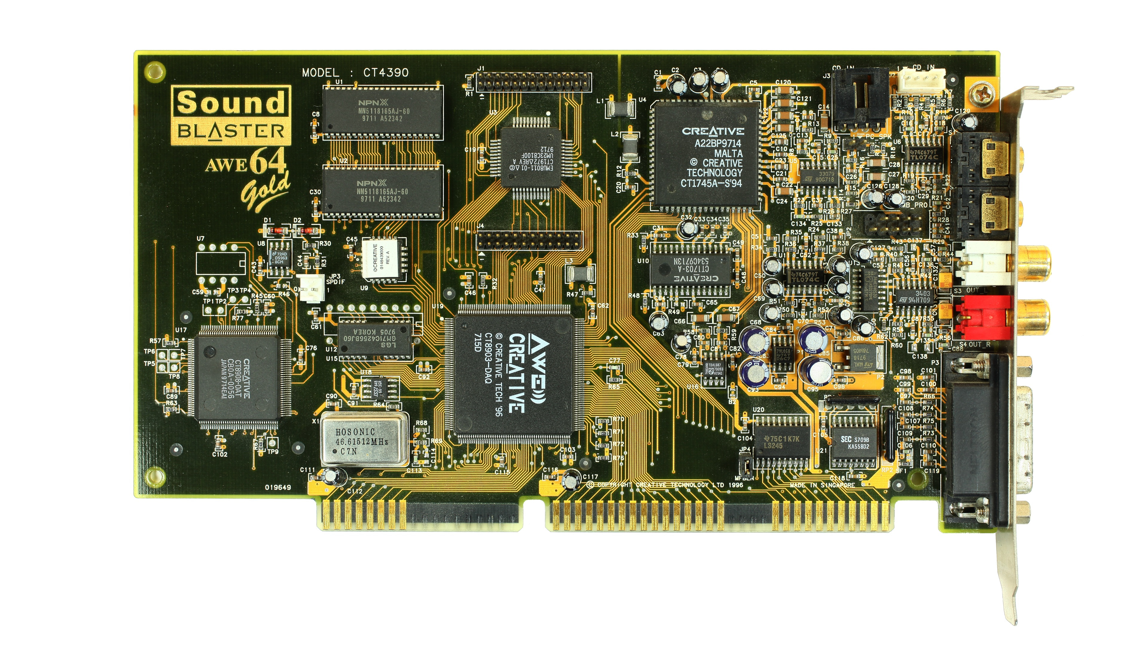 The Sound Blaster AWE64 was released in November of 1996, and it improved on the AWE32 in a few ways. First, it increased the signal to noise ratio (especially in the Gold version), and increased component integration resulting in traces that likewise avoided noise. Given increases in integration, the board also became smaller than its predecessor and decreased cost. It’s also notable that with general technological advancements made in the industry, the ICs were of a consistently higher quality than those used in earlier cards despite being less expensive. The card came in two versions; one was the standard version which later was re-branded as the Value version (CT4500) with 512K RAM, and the other was the Gold version (CT4390) with 4MB of RAM, a 20bit DAC, and separate SPDIF output. Functionally, there were two major differences between the AWE64 and AWE32. The AWE64 added WaveGuide which synthesizes instrument sounds. While the Wave Blaster is no longer supported, the AWE64 Gold does have line inputs on the rear for an external Sound Canvas or similar product. Effectively, the WaveGuide feature allowed for greater polyphony through the use of 32 extra software-emulated channels, but in practice this used more CPU time and wasn’t very popular. The other change was the removal of 30-pin SIMM slots in favor of proprietary memory daughter boards. In all other respects, the AWE64 was simply a better AWE32. For purists, the AWE64 lacks Sound Blaster Pro compatibility and genuine OPL3 FM Synthesis, but for those who want SB16 compatibility, mostly noise-free output, hassle-free plug-n-play, and General MIDI capabilities, the AWE64 is wonderful. For collectors today, however, owning a genuine AWE64 Gold will set a buyer back between $200 and $400. That price will increase for those desiring a SIMMConn (replacing the proprietary memory daughter board with a 30-pin SIMM adapter).