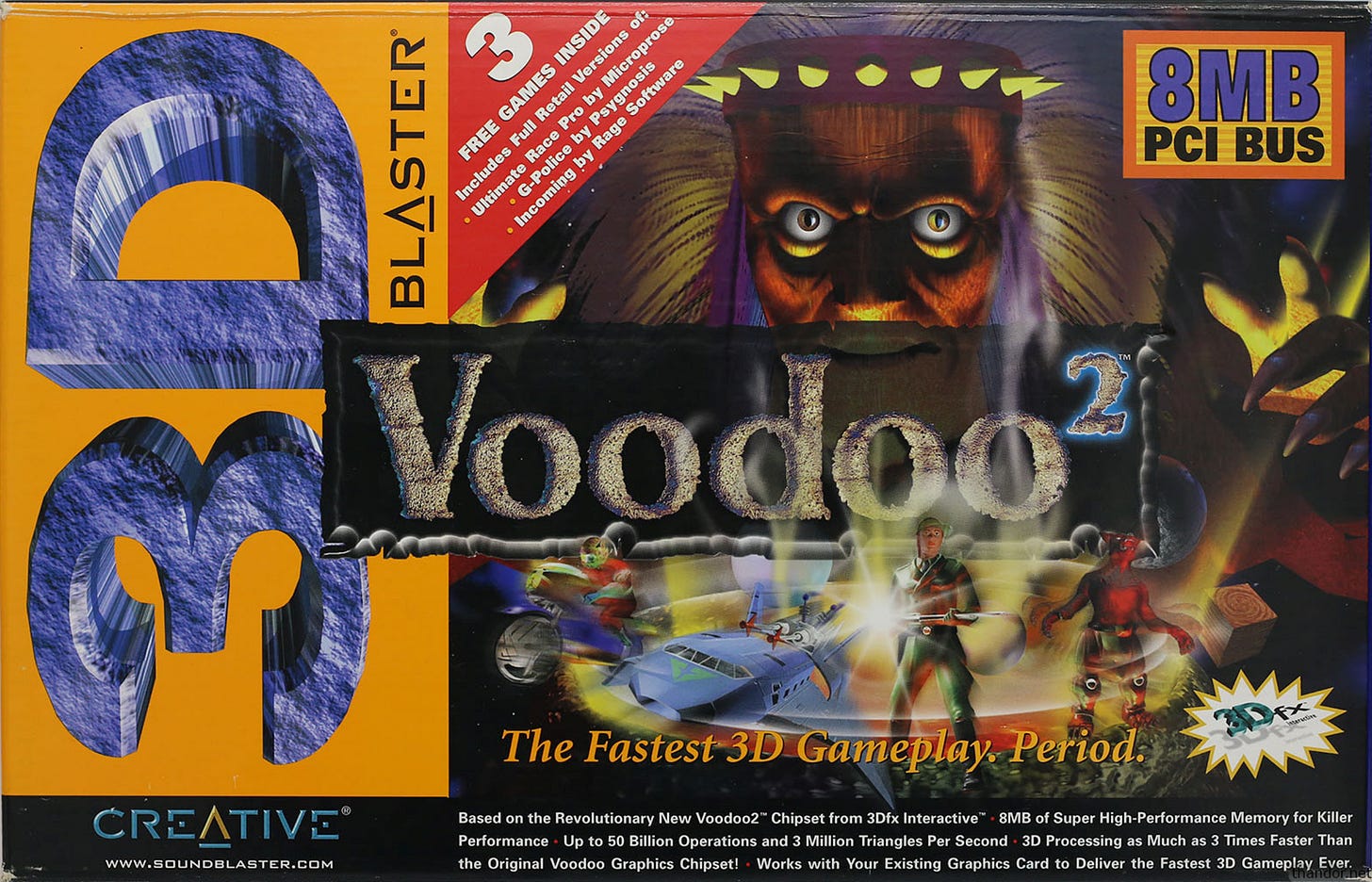 On the 20th of January in 1998, Creative chose to remedy the mistake it had made with their first 3D accelerator, and they released the CT6670, or 3D Blaster Voodoo2. It used the PCI bus, had 8MB of 25ns EDO RAM, and like all Voodoos, supported Glide. In September the same year, the company released the 3D Blaster Voodoo Banshee AGP card (CT6750) as well as the CT6760 PCI card. Depending upon the SKU, these could come with 8MB, 12MB or 16MB of SDRAM. While using the same name, the AGP card was designed entirely by Creative, and it was the only Creative board using a 3dfx chip to be so.
