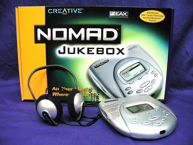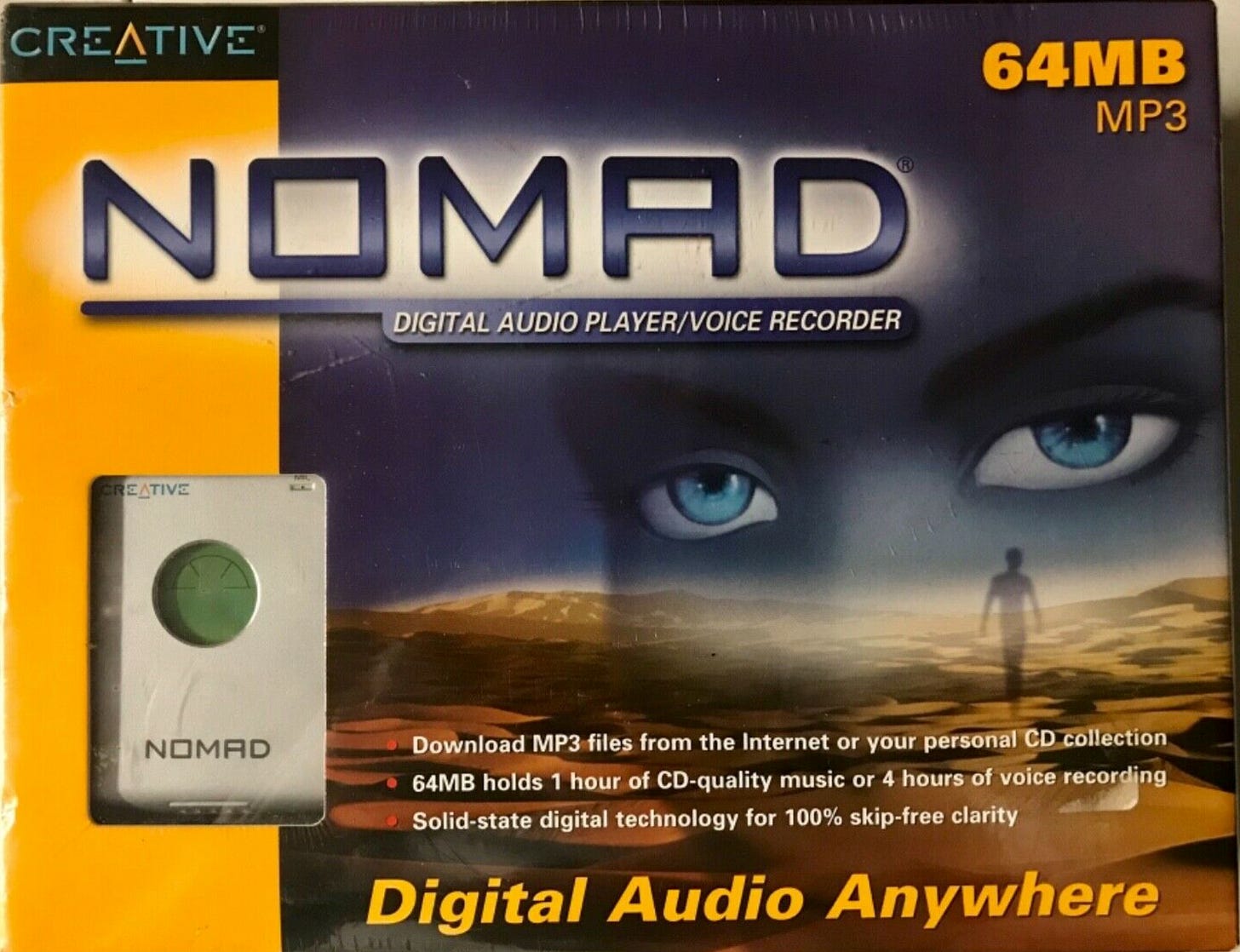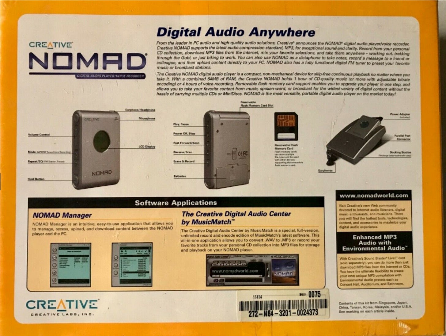 Creative had some great timing with one particular product. WinAmp brought MP3 support to the desktop in 1997, and Windows Media Player 5.2 gained MP3 support in 1998. Creative released the NOMAD MP3 player in April of 1999 for $429. In June of 1999, Napster was born, and MP3s exploded in popularity. The NOMAD connected to a user’s PC via a cradle, and that cradle attached to the PC via parallel port. The device had either 32MB or 64MB of battery backed RAM depending upon the model purchased, with more storage provided by flash media. The NOMAD also provided an FM tuner for those who wished to listen to radio, and a microphone for voice recordings. On the PC side of things, Creative provided both a CD ripper and the NOMAD Manager. The latter of which was for handling the transfer of content to the device. The box proudly claims that 64MB would provide an hour of CD-quality audio, and that’s… well… not true at all. MP3 encoding is quite lossy, and to compress 700MB of lossless CD audio into 64MB infers an incredibly low sample rate. An hour of audio in 64MB would absolutely not be “CD-quality.” Marketing aside, the NOMAD was a cool product.