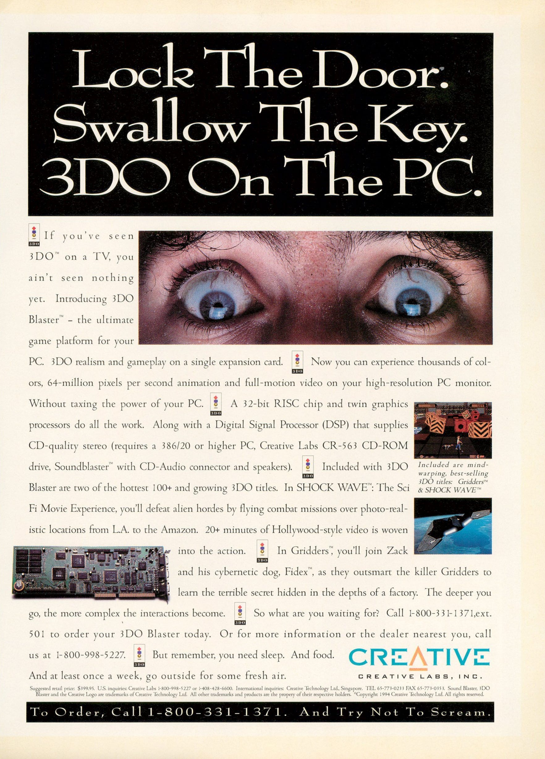On the 26th of October in 1994, in time for the Christmas shopping season, Creative released the 3DO Blaster. This brought 3DO games to the PC via a full-length, 16bit, ISA card. On the card was a 32bit RISC CPU, a DSP for CD audio, two graphics processors, 2MB of RAM, 1MB of ROM, 1MB of VRAM, and 32K SRAM with battery backup. The box contained two games (Shockwave, Gridders), some demos, drivers, Aldus Photostyler and Gallery Effects, a controller, manuals, the card itself, and a registration card. Of course, the 3DO blaster was not, itself, a standard VGA card. To use the 3DO Blaster, one’s PC would need to be at least a 25MHz Intel 386, have at least 4MB of RAM, a VGA card, Windows 3.1, a CD-ROM drive (either Matsushita or Creative CR-564), a Sound Blaster, and some speakers. The press release from 3DO read, in part: