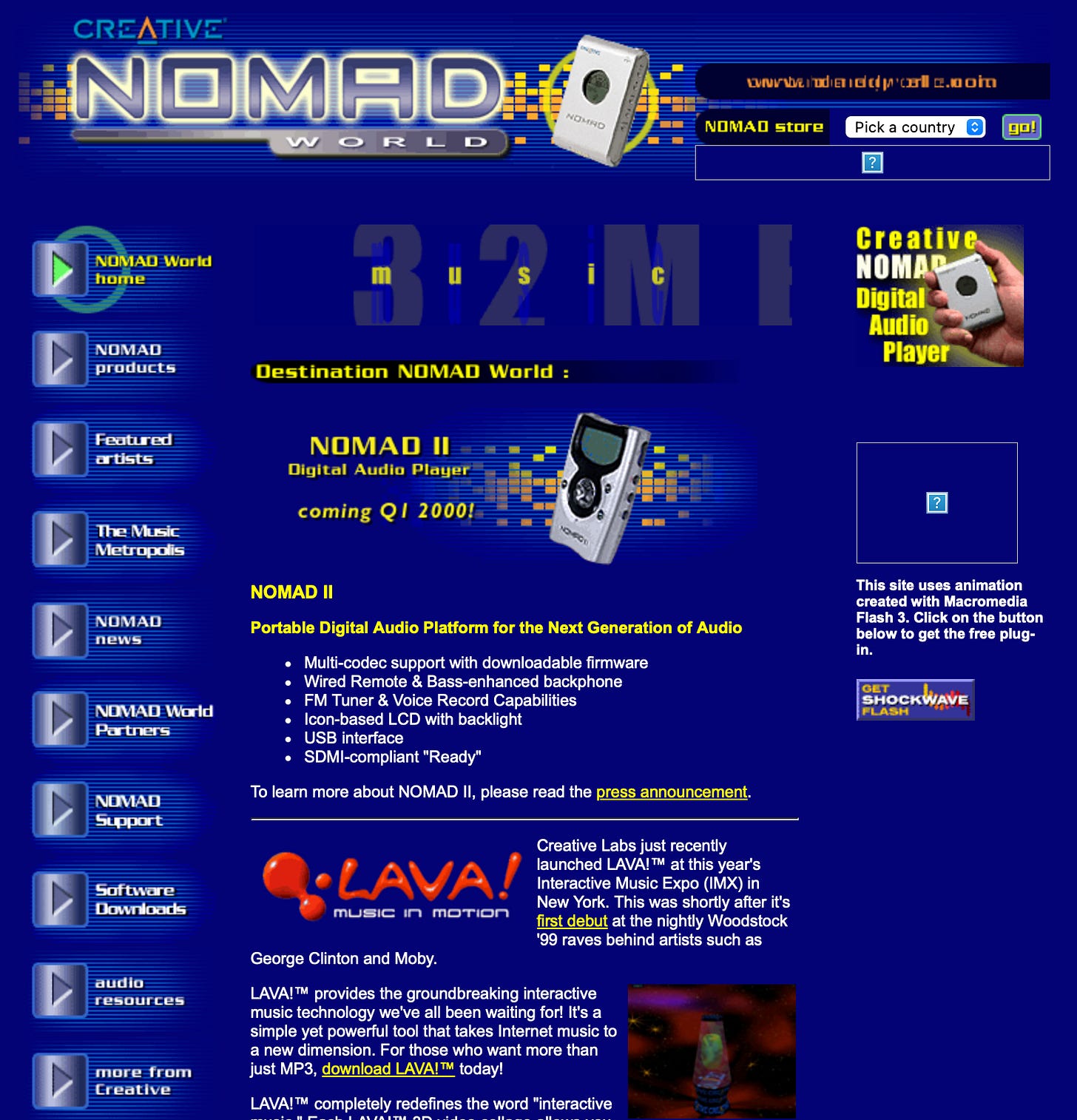 The NOMAD II launched the following year, and it was well received by the press. This time, Creative used USB 1.1 instead of parallel, 32MB of internal memory, bundled 64MB Smart Media flash, and added EAX support, WMA support, a backlight for the LCD, a wired remote for controls, and slightly better microphone for voice recording. This was followed by the IIc which removed the FM tuner and offered either 64MB or 128MB of internal memory.
