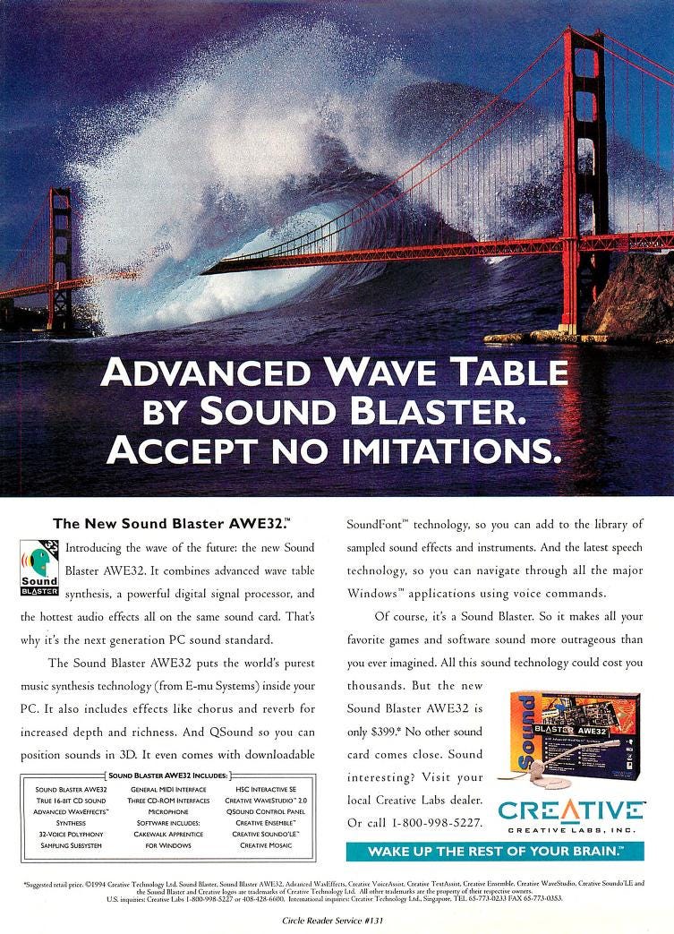 1998 was a year of intense litigation for Creative. The first suit was filed by Creative against Aureal over MIDI caching patent infringements. This was followed by a counter claim of defamation and unfair competition by Aureal against Creative. Creative’s advertising of the Sound Blaster Live! then sparked more lawsuits by Aureal against Creative over claimed falsehoods. By the end of 1999, Aureal had won but had gone bankrupt as a result of legal costs. I am sure it cut quite deeply, but Creative acquired Aureal in September of 2000 for $32 million.